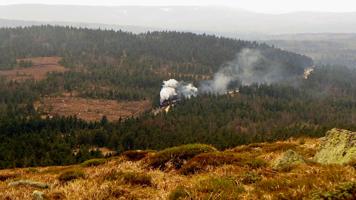 99 7234-0 hat noch einen weiten und steilen Weg vor sich. Das Ziel ist schon in Sichtweite, doch P 8933 muss den Brocken noch einmal umfahren. Bald wird der Zug hier oben am Fotografen vorbeifahren.