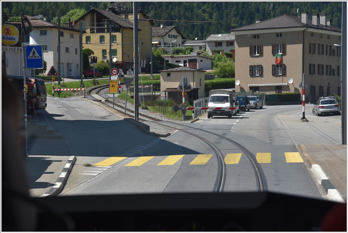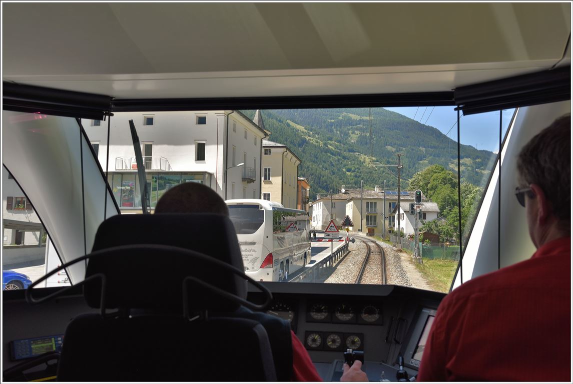 Blick über die Schultern im BerninaExpress 950. Wir nähern uns der Kirche Sant Antonio in Li Curt, wo sich die Bahn den Engpass mit der Strasse teilt. (28.06.2016)
