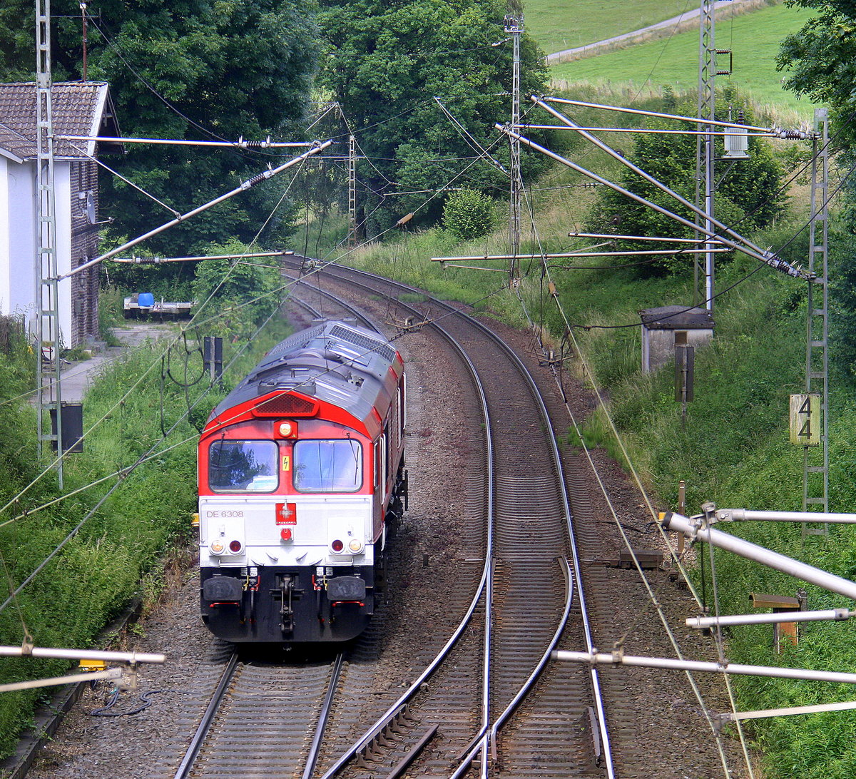Die Class 66 DE6308 "Anja" von Crossrail kommt die Gemmenicher-Rampe hochgefahren und fährt als Lokzug aus Aachen-West nach Montzen-Gare(B) und fährt gleich in den Gemmenicher-Tunnel hinein. Aufgenommen in Reinartzkehl an der Montzenroute. Am Nachmittag vom 4.7.2016.