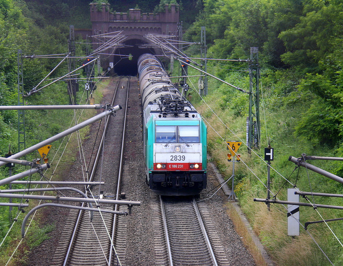 Die Cobra 2839 kommt aus dem Gemmenicher-Tunnel raus mit einem Kesselzug aus Antwerpen-BASF(B) nach Ludwigshafen-BASF(D) und fährt nach Aachen-West und rollt die Gemmenicher-Rampe herunter nach Aachen-West. Aufgenommen in Reinartzkehl auf der Montzenroute. Am Nachmittag vom 4.7.2016.