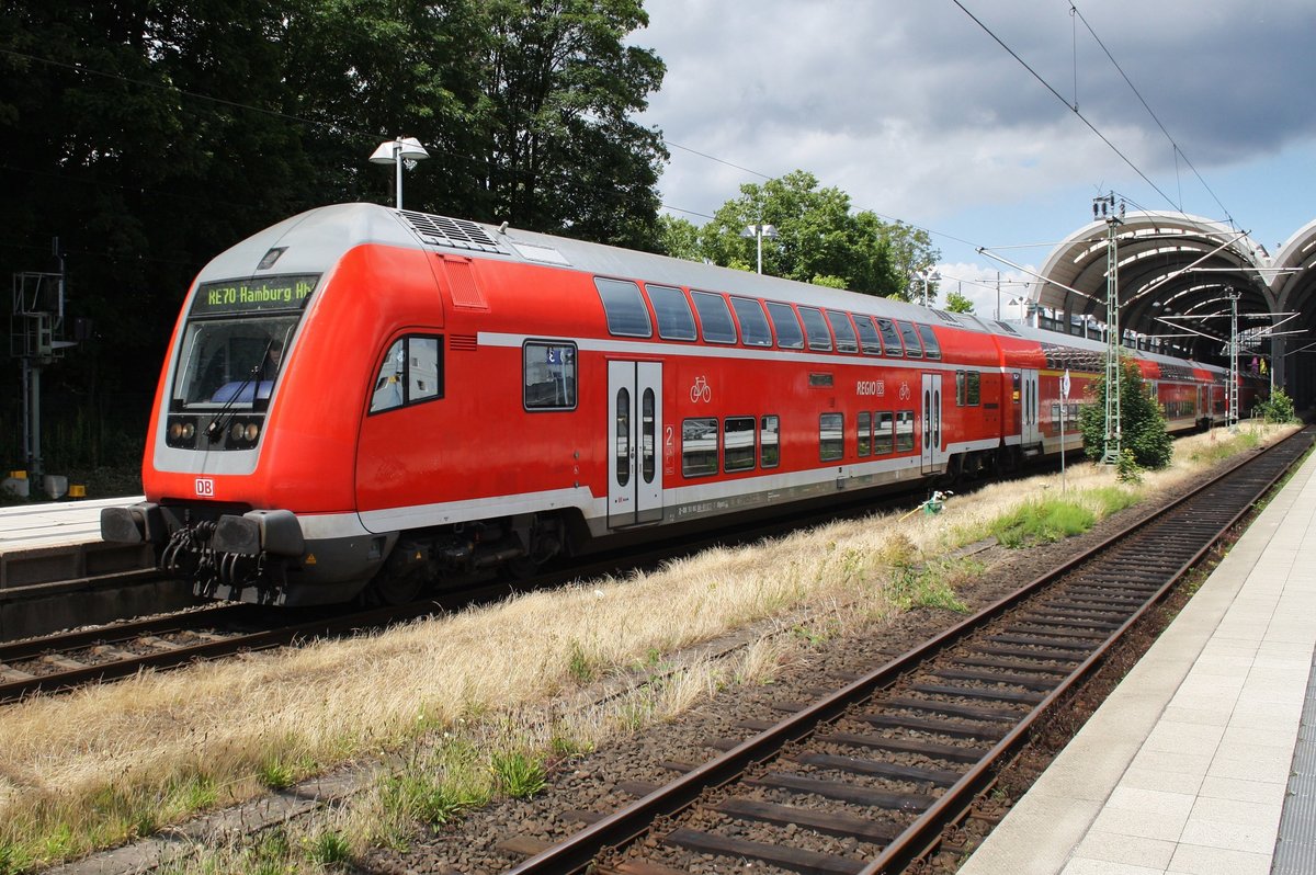 In umgekehrter Wagenreihung verlässt ein RE70 (RE21023) nach Hamburg Hauptbahnhof am Nachmittag des 4.7.2016 den Kieler Hauptbahnhof. Schublok für diese Leistung war die Kieler 112 147.