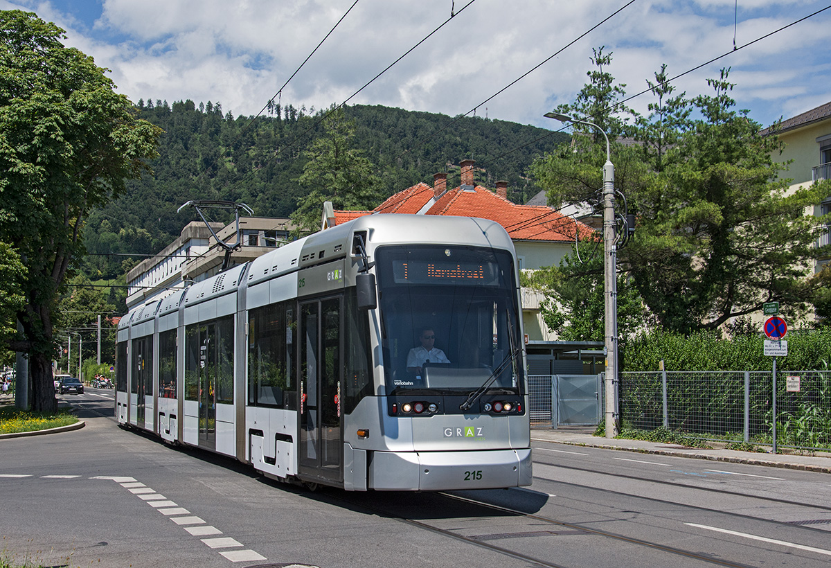 Seit 02.07.2016 werden auch Variobahnen ganztägig auf der Linie 1 (Eggenberg -Jakominiplatz) eingesetzt da der Abschnitt Jakominiplatz - Mariatrost derzeit wegen Bauarbeiten gesperrt ist. Variobahn 215 als Linie 1 in der Georgigasse beim Schloß Eggenberg, 04.07.2016.