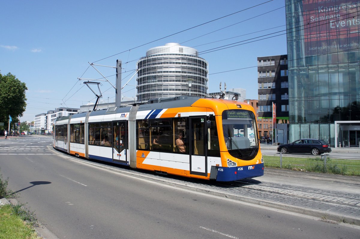 Straßenbahn Heidelberg / Rhein-Neckar-Verkehr GmbH (RNV) / OEG (Oberrheinische Eisenbahn Gesellschaft): Bombardier Variobahn RNV6 der Rhein-Neckar-Verkehr GmbH - Wagen 4126, aufgenommen im Juni 2016 am Hauptbahnhof in Heidelberg.
