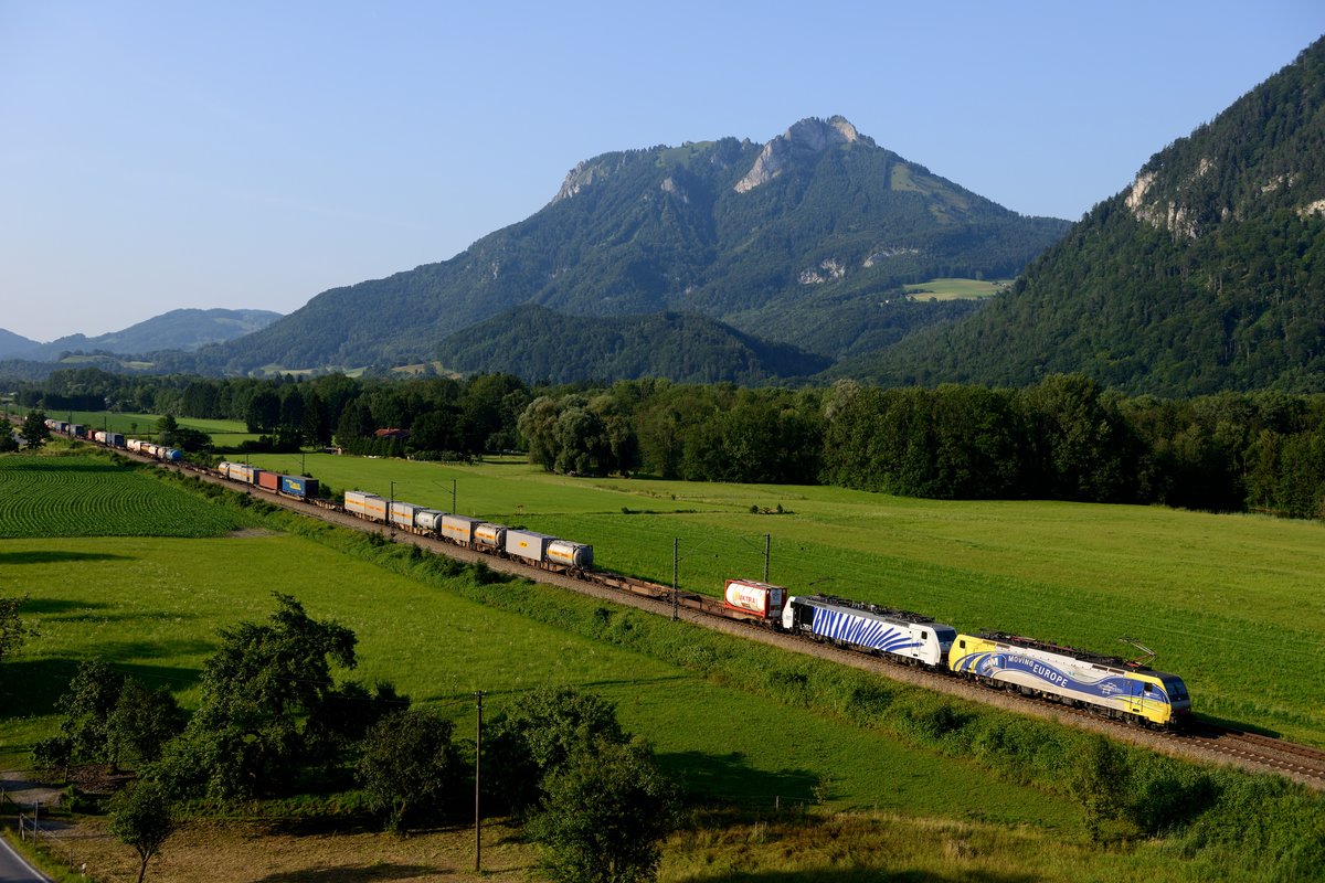 Vor der imposanten Kulisse des Heubergs rauschte am ungewöhnlich klaren Abend des 14. Juli 2013 ein Zug des kombinierten Ladungsverkehrs durch das Inntal bei Flintsbach. Geführt wurde der Zug von einem Lokomotion 189-er Tandem, der gelb-silbernen 189 912, die für das CREAM Projekt Werbung macht und dem blauen Zebra 189 907.