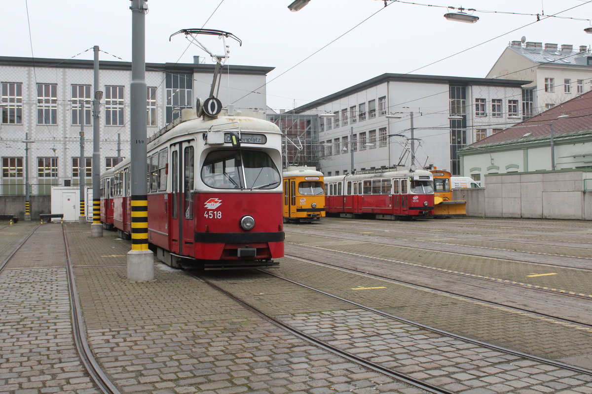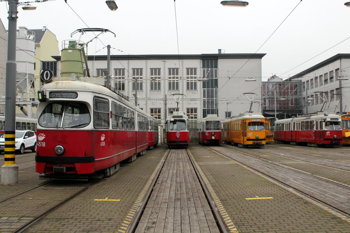 Wien Wiener Linien Bahnhof (= Straßenbahnbetriebsbahnhof) Favoriten am 18. Februar 2016: U.a. sind die folgenden Wagen zu sehen: E1 4518 (als SL O beschildert), E2 4057, c5 1503, EM 6117 (Gleismesswagen, aus dem E1 4700 umgebaut) und E1 4513.