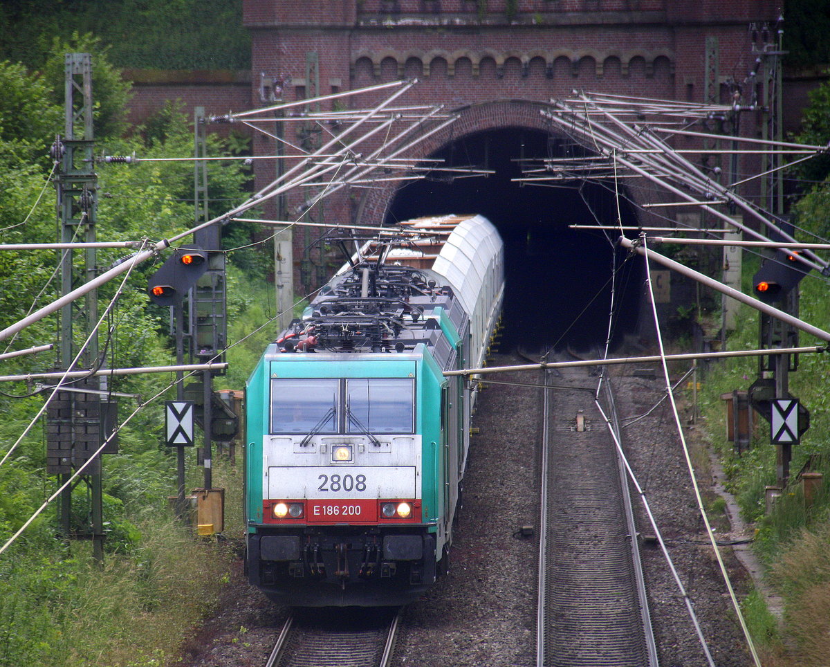 Zwei Cobra 2808 und 2836 kommen mit einem schweren Kalkzug aus Yves-Gomezee(B) nach Millingen-Solvay(D) aus dem Gemmenicher Tunnel raus und fahren die Gemmenicher-Rampe hinunter nach Aachen-West. Aufgenommen bei Reinartzkehl an der Montzenroute. Am Nachmittag vom 4.7.2016.