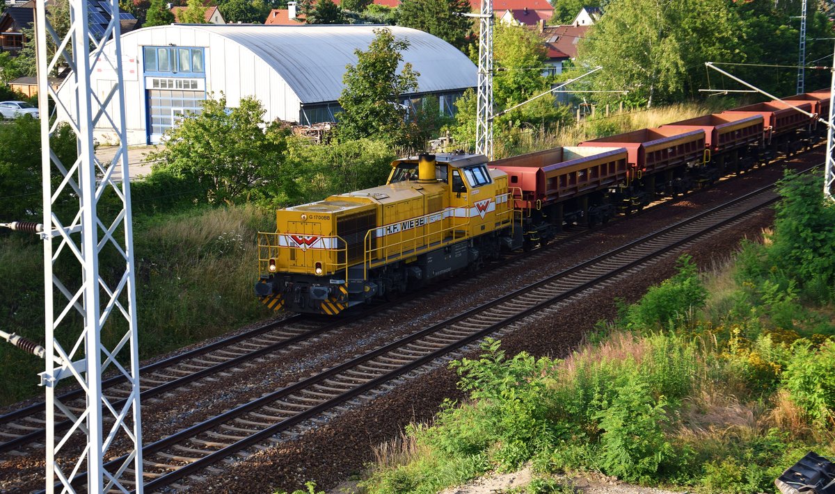 Nachdem der EC 171 das Streckengleis freimachte, konnte auch 740 422 der AWT am 14.06.16 ihre Fahrt mit dem kurzen Schotterzug Richtung Decin fortsetzen.