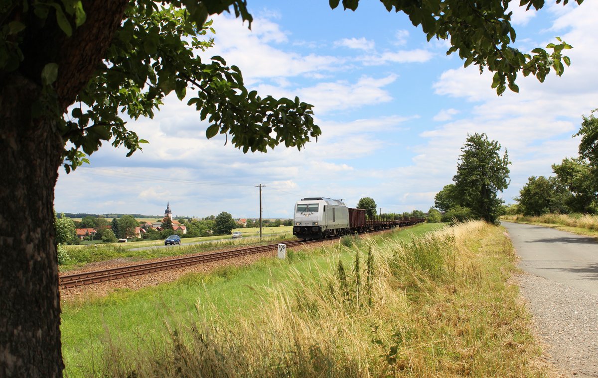 Am Morgen des 20. Juli 2013 fährt 185 207 mit ihrem GA 60076 von Seelze nach Ingolstadt Nord bei Gambach am Main entlang.