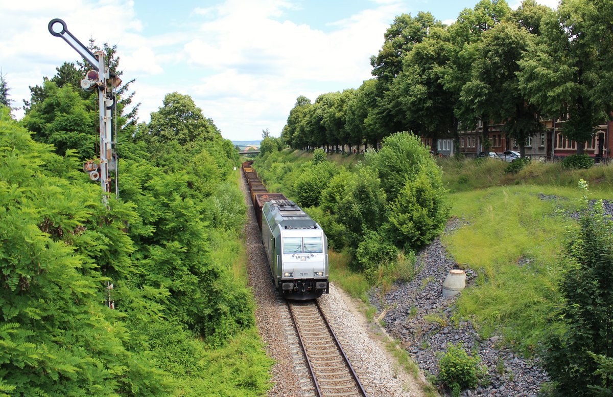 In Bayern eher selten zu sehen sind Fahrzeuge des ostdeutschen EVU ITL. Am 19. Juli 2013 konnte die 185 517 mit einem Containerzug bei Gemünden abgelichtet werden.