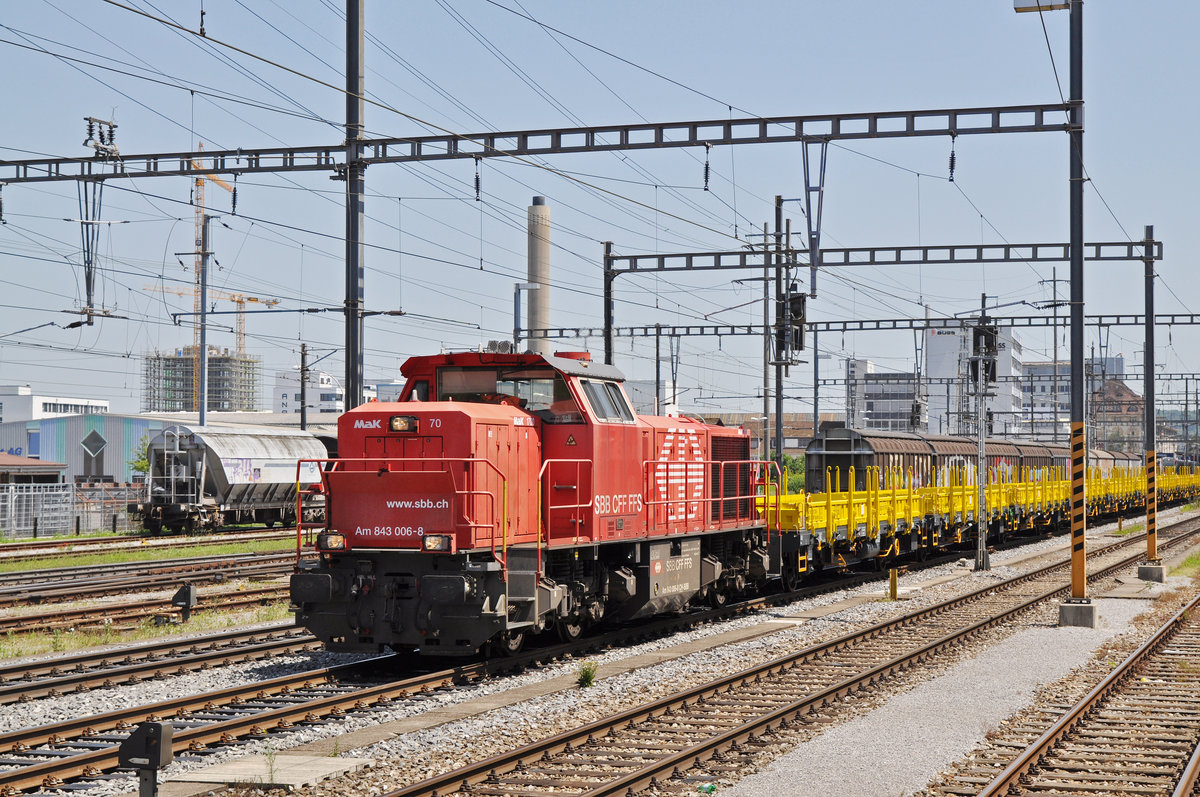 Am 843 006-8 durchfährt den Bahnhof Pratteln. Die Aufnahme stammt vom 24.06.2016.
