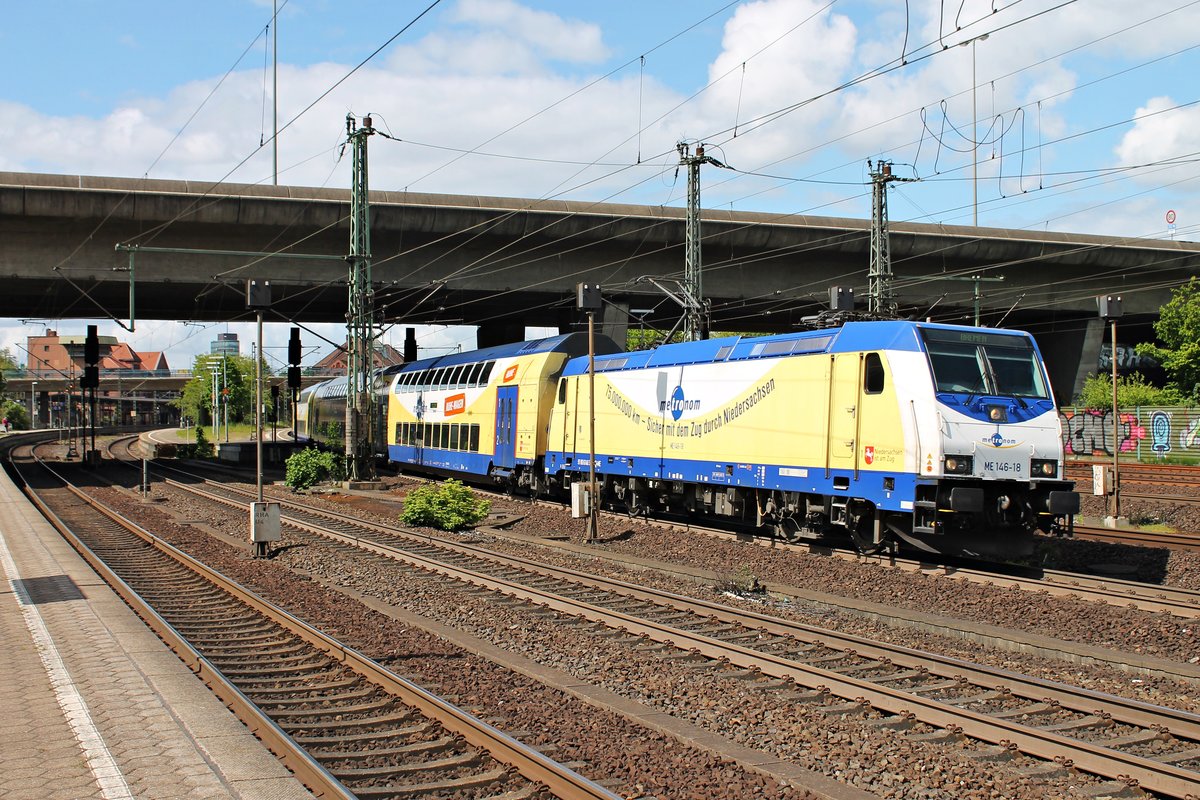 Ausfahrt am 26.05.2015 von ME 146-18 (146 518-6) "75.000.000 km - Sicher mit dem Zug durch Niedersachsen/Burgwedel" mit einem Metronom (Hamburg Hbf - Bremen Hbf) aus Hamburg Harburg gen Süden.