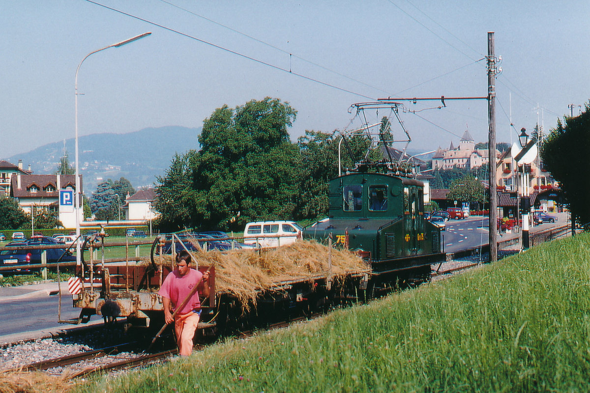 BC: Nebst den vielen Nostalgiezügen, die während den Wochenenden auf der Museumsstrecke verkehren, trifft man im Sommer an Wochentagen mit etwas Fotografenglück auf "HEUZÜGE", so im Sommer 1999 mit der Ge 4/4 75, ehemals +GF+, bei Blonay.