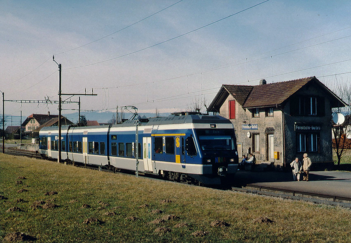 BLS: Eine aus den 90er-Jahren stammende S5 mit einem RABe 525 NINA bei einem Zwischenhalt in Ferenbalm Gurbrü.