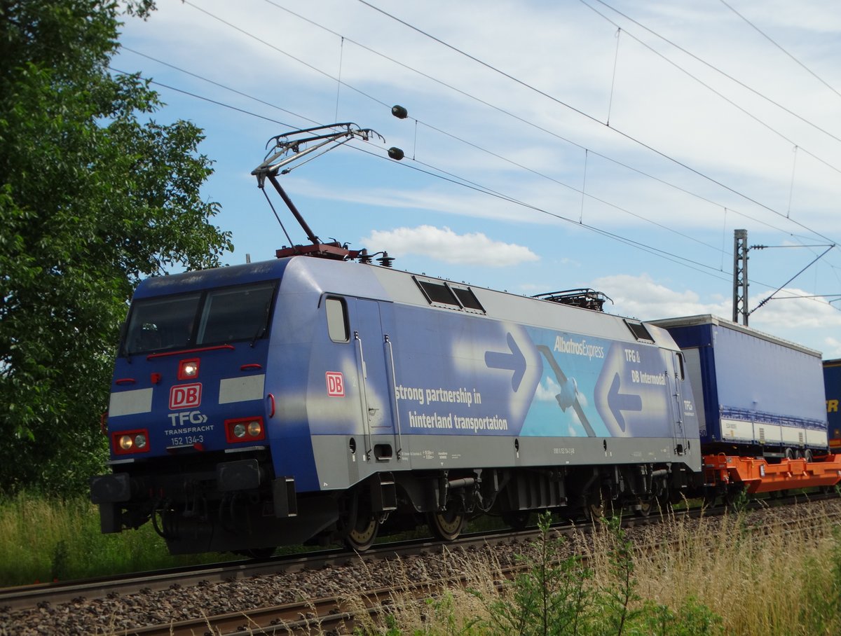 DB Cargo 152 134-3 ALBATROS Werbung mit KLV am 29.06.16 bei Walluf