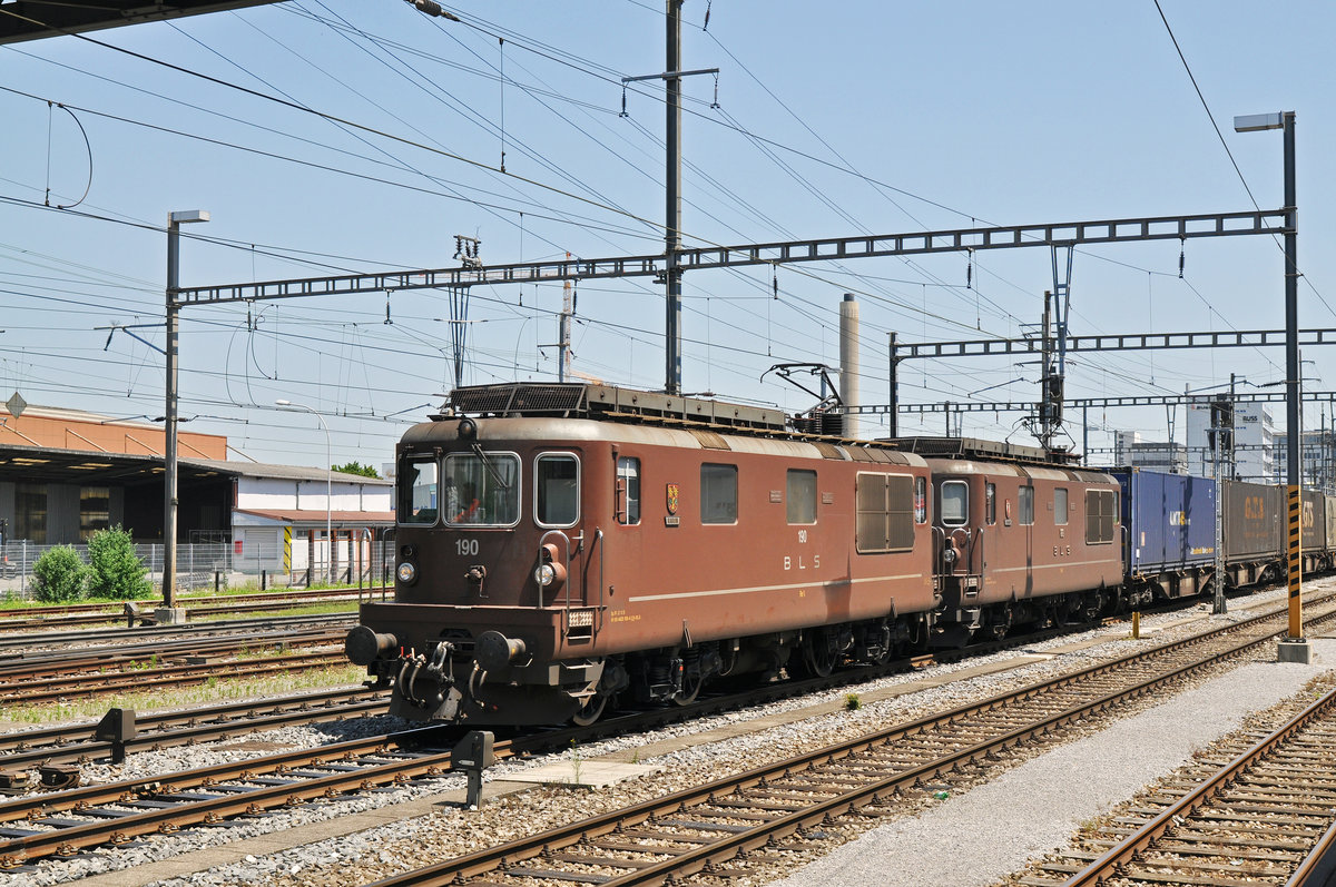 Doppeltraktion, mit den BLS Loks 425 190 und 425 186, durchfahren den Bahnhof Pratteln. Die Aufnahme stammt vom 24.06.2016.