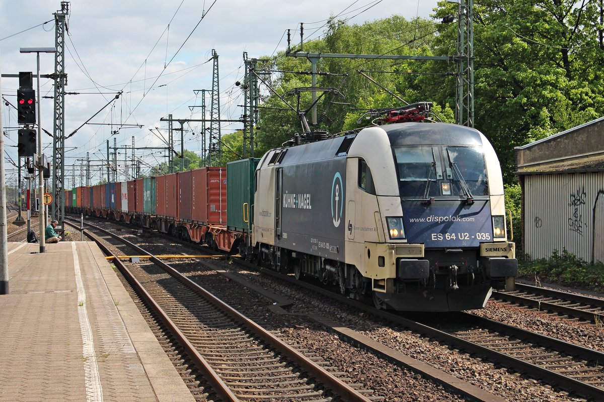 Durchfahrt am 26.05.2015 von MRCE/WLC ES 64 U2-035 (182 535-5) "KÜHNE+NAGEL" mit einem Containerzug aus Österreich in Hamburg Harburg gen Hamburger Hafen.