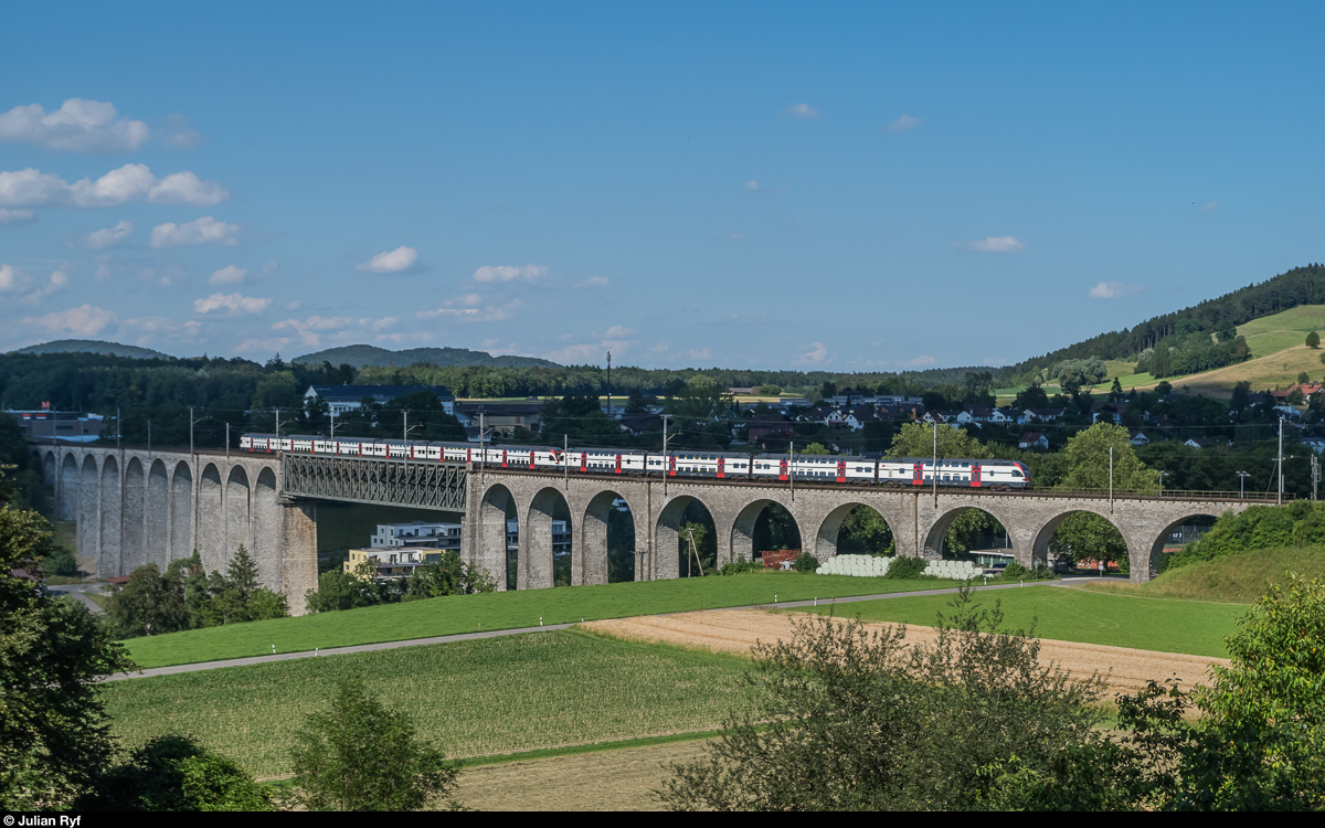 Eine DPZ-Dreifachtraktion ist am 28. Juni 2016 auf der S9 bei Eglisau unterwegs, wo der Rhein überquert wird.