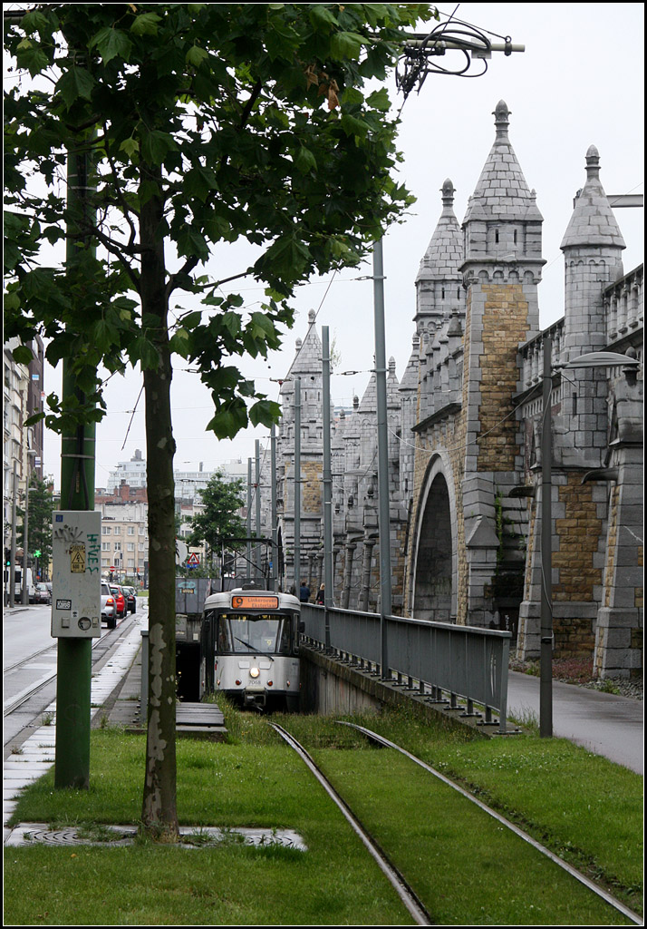 Das Bauwerk rechts ist keine Burg oder sowas sondern die kunstvoll ausgeführte Stützmauer der Bahntrasse der Strecke zum Bahnhof Antwerpen Centraal.