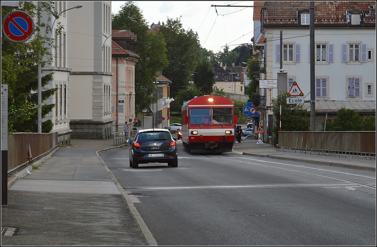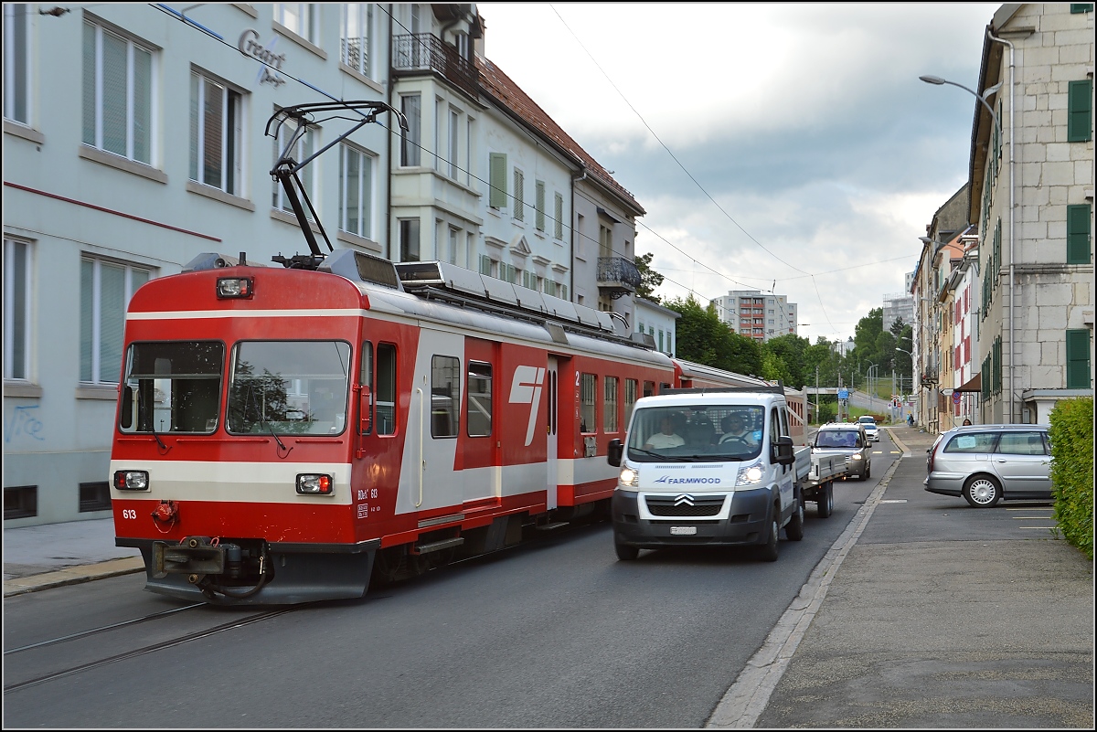 Geisterfahrer BDe 4/4 613 der CJ in der Rue de Manège in La-Chaux-de-Fonds. Wenn man genau hinschaut, fährt der Zug auf der falschen Seite der Strasse, der Autoverkehr muss auf Gegenseite ausweichen. Hinter dem Zug herfahren ist daher schwierig, denn es geht nur voran, wenn man den Gegenverkehr durchlässt. Juli 2016.