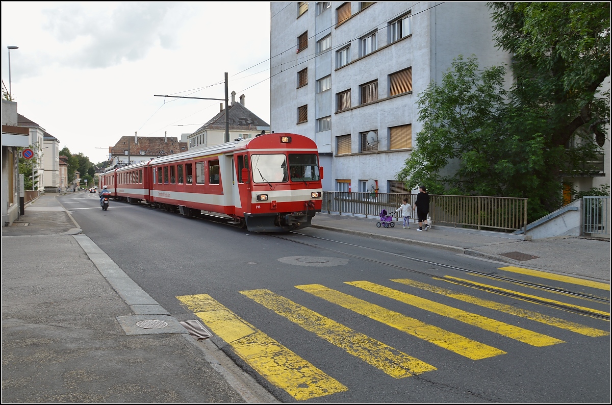 Geisterfahrer BDe 4/4 613 der CJ in der Rue de Manège in La-Chaux-de-Fonds. Hier frage ich mich aber, ob denn nun auf dem Zebrastreifen die Strassenverkehrsordnung oder die Bahnverkehrsordnung gilt... Oder anders gesagt, muss der Zug halten, würde die die Dame mit Kind hier die Strassenseite wechseln wollen. Juli 2016.