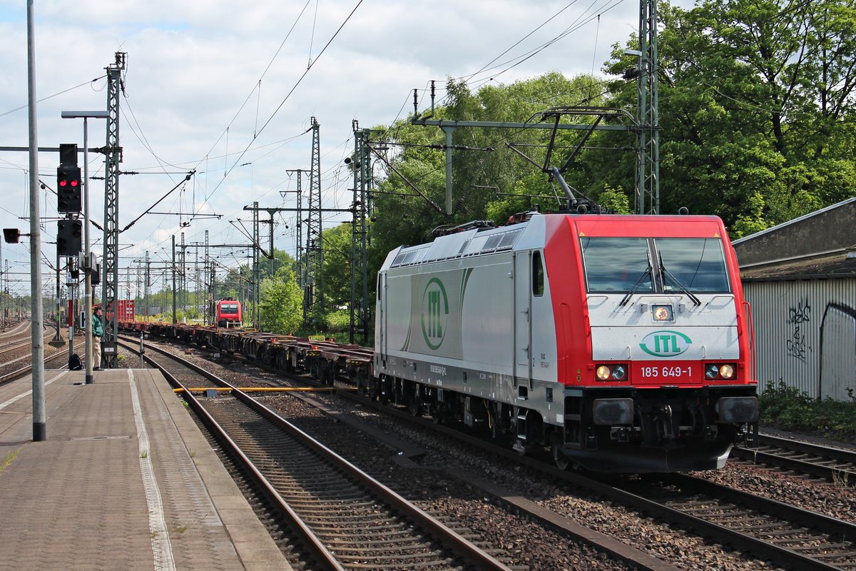 ITL 185 649-1 am 26.05.2015 bei der Durchfahrt mit einem fast leeren Containerzug in Hamburg Harburg gen Hafen.