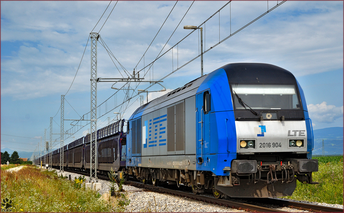 LTE 2016 904 zieht leeren Autozug durch Cirkovce-Polje Richtung Hodoš. /1.7.2016