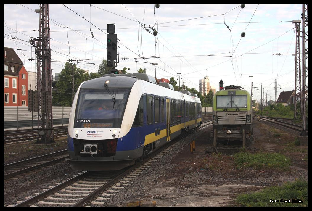 VT 648376 der NWB fährt am 04.07.2016 um 08.43 Uhr auf Gleis 12 in den unteren HBF Osnabrück ein. Rechts ist die geparkte 193891 von Captrain auf dem Abstellgleis zu sehen.