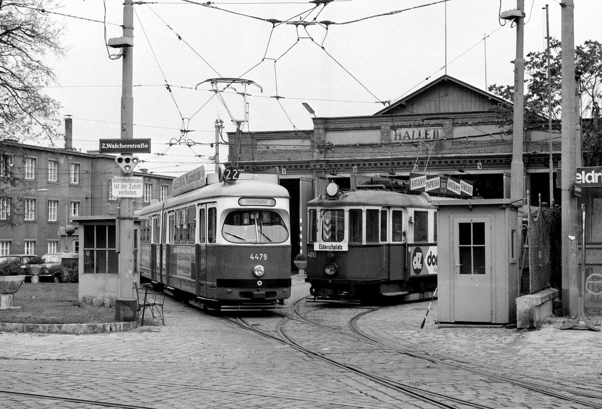 Wien Wiener Stadtwerke-Verkehrsbetriebe (WVB): Am 1. November 1976 halten im Bahnhof Vorgarten der E1 4479 als SL 22 (Z) und der M 4093. - Die Zentralfriedhoflinie 22 gab es zu Allerheiligen von 1907 bis 1981. - Scan von einem S/W-Negativ. Film: Ilford FP 4. Kamera: Minolta SRT-101.