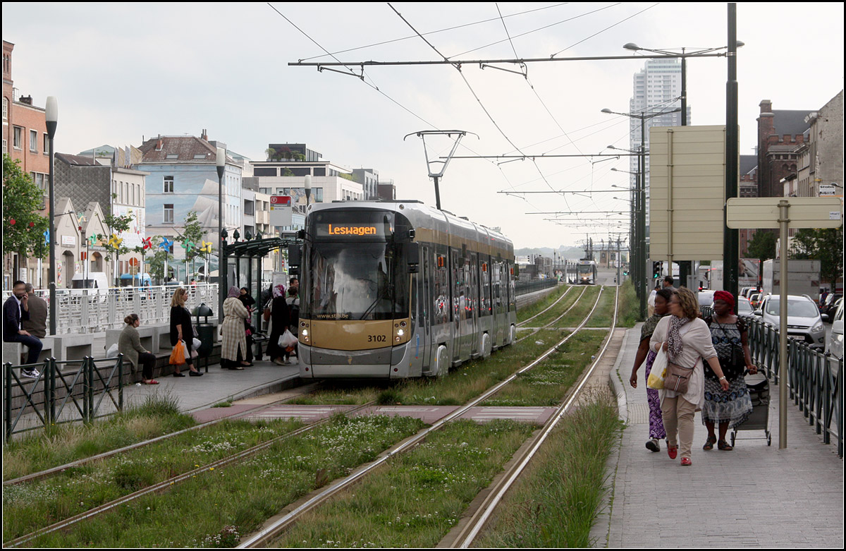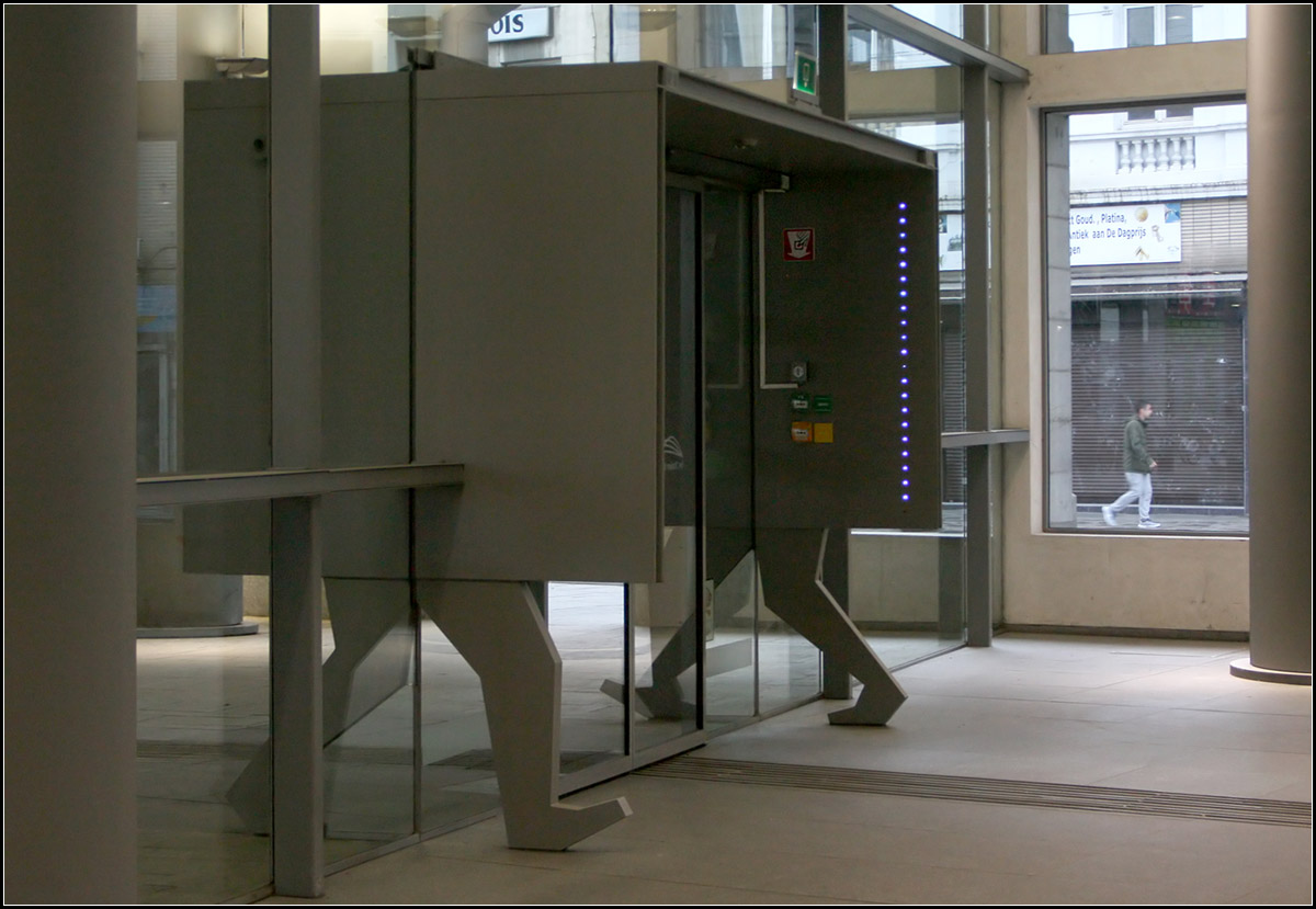 Am neuen Südausgang von Antwerpen Centraal zeigen einem diese stilisierten Beine an, dass sich zwischen den eigenartigen Kästen die Ausgänge mit den Schiebetüren befinden. Die Beinhaltung beim Gehen kann hier am realen Modell verglichen werden.