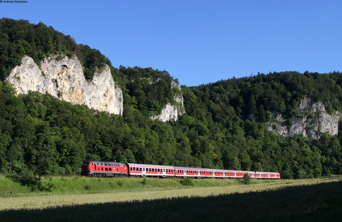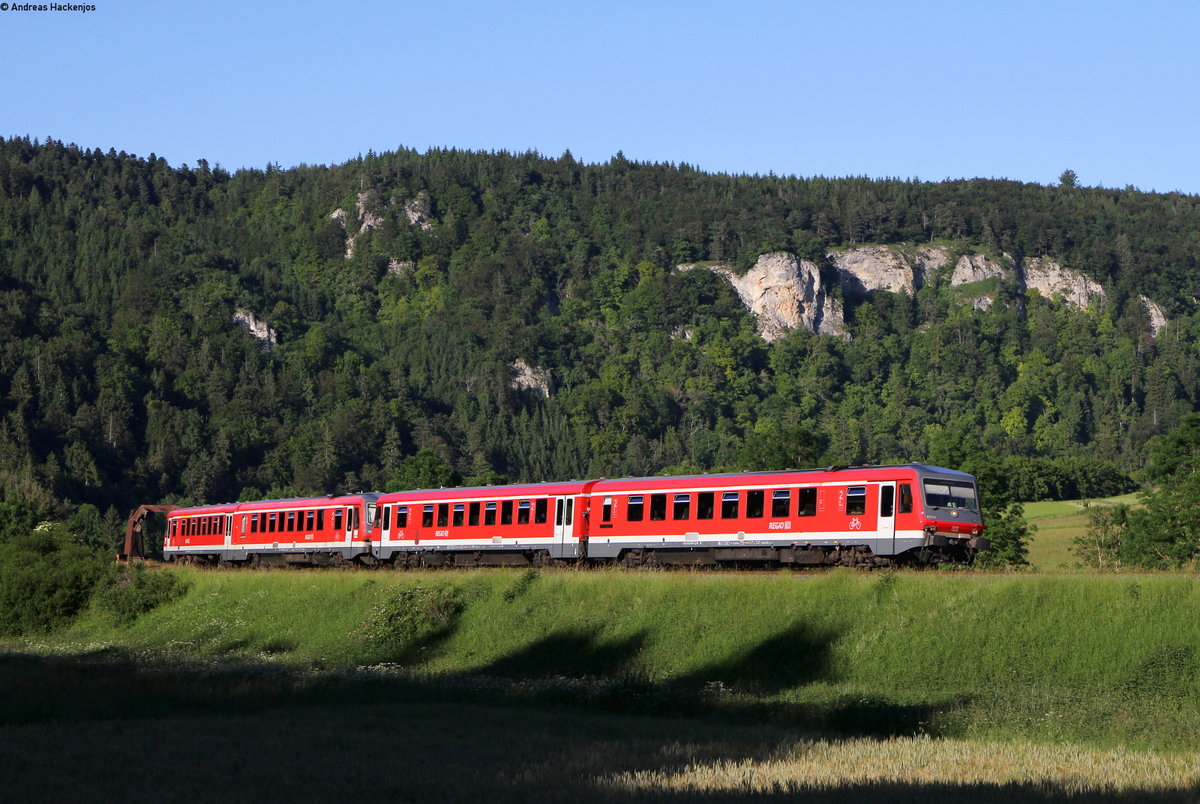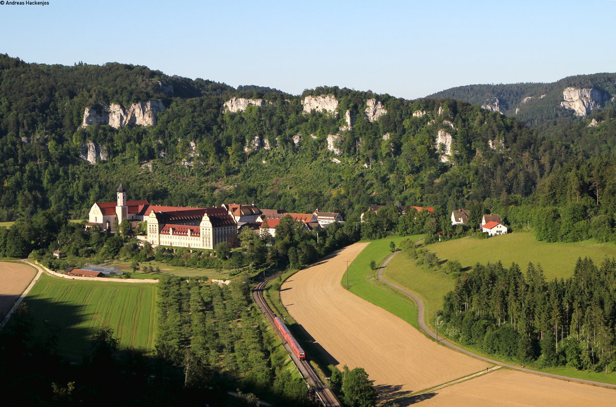 Vom (fast) neuen Nahe Skywalk bei Hochstetten-Dhaun hat man einen schönen Überblick über das Nahetal im Kirner Land. Ein Lint 54 und ein Lint 81 von vlexx haben als RE Saarbrücken - Mainz gerade den Bahnhof Kirn verlassen.Bis Bad Kreuznach geht es nun entlang der Nahe, mit reizvollen Ausblicken über Weinberge oder schroffe Felsen bei Bad Münster am Stein. Bahnstrecke 3511 Bingerbrück - Saarbrücken am 23.06.2016