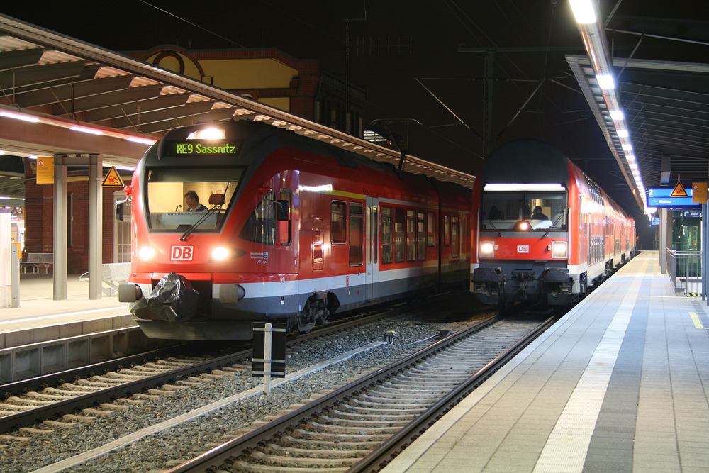 Abendliche Impression aus dem Rostocker Hbf mit einem ET der Baureihe 429 sowie einem Dosto-Wagenpark.