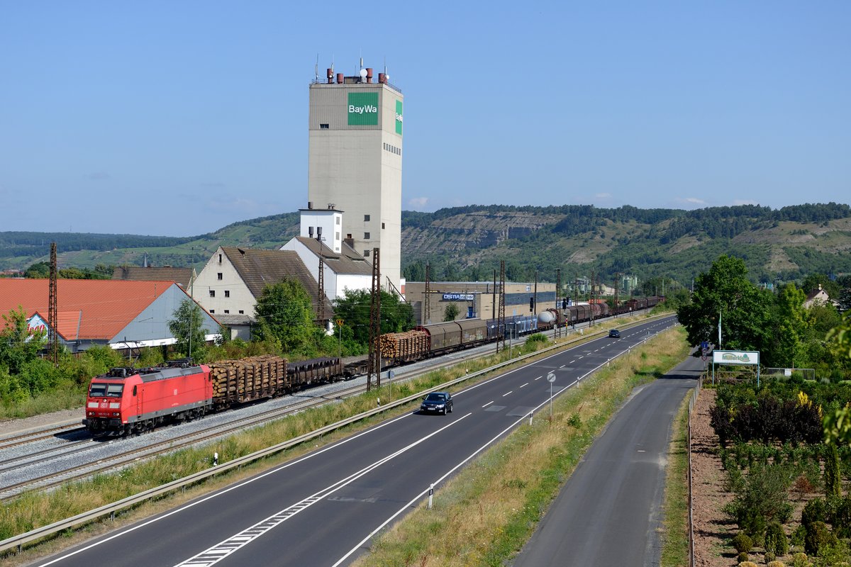 Am 20. Juli 2013 passiert 185 112 mit ihrem langen EZ 51887 von Mannheim Rbf nach Nürnberg Rbf das markante BayWa Lagerhaus und die Baumschule Müllerklein in Karlstadt.