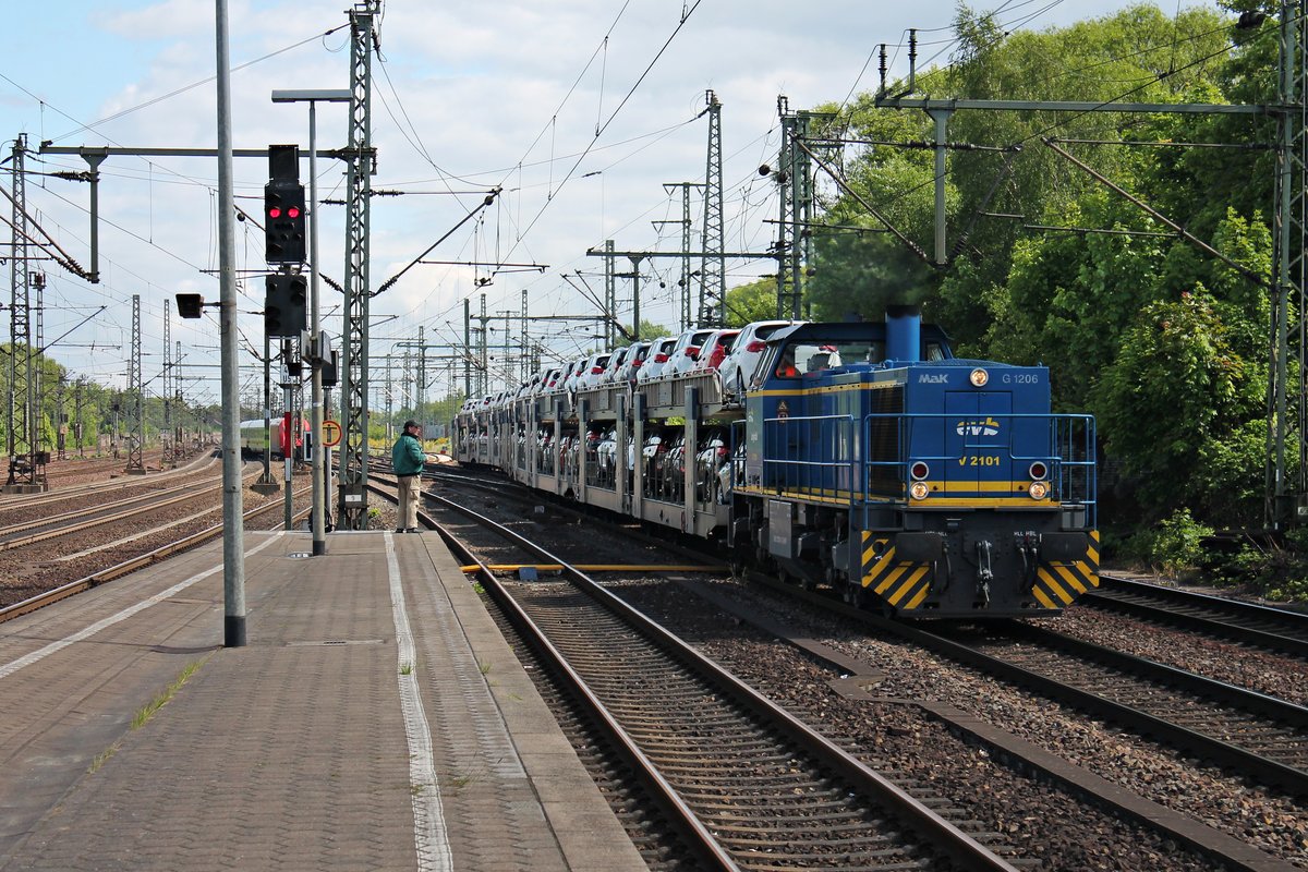 Ausfahrt am 26.05.2015 von V 2101 (275 101-4) der MWB mit einem BLG-Autozug aus dem Güterbahnhof Harburg gen Hamburger Hafen und fuhr durch den Harburger Bahnhof.