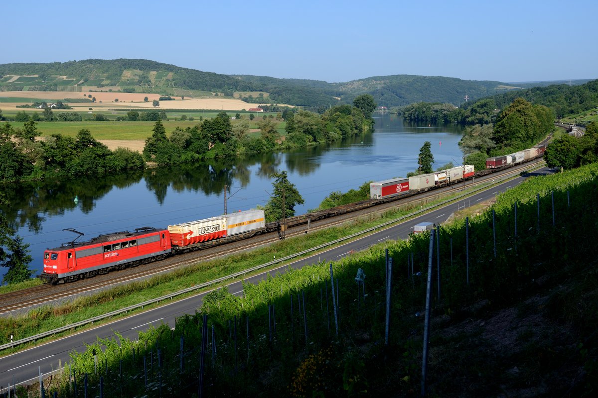 Den KT 40553 von Genk Zuid nach Verona hat hier 151 017 am Haken, die noch die Railion Beschriftung trägt. Aufgenommen wurde diese samstägliche Leistung am 20. Juli 2013 von den Weinbergen bei Gambach aus.