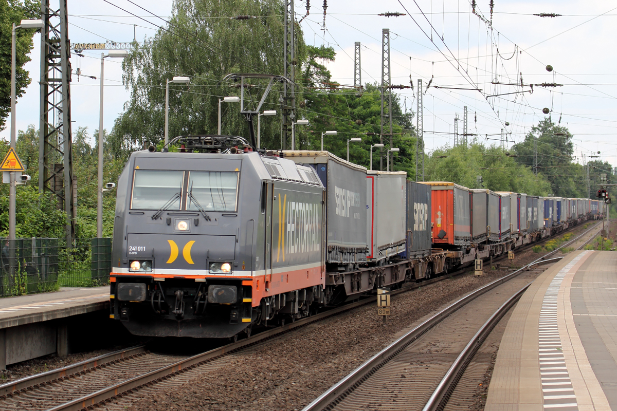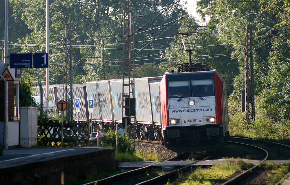 E 186 181 durchfährt zu morgendlicher Stunde den Bahnhof von Stommeln.