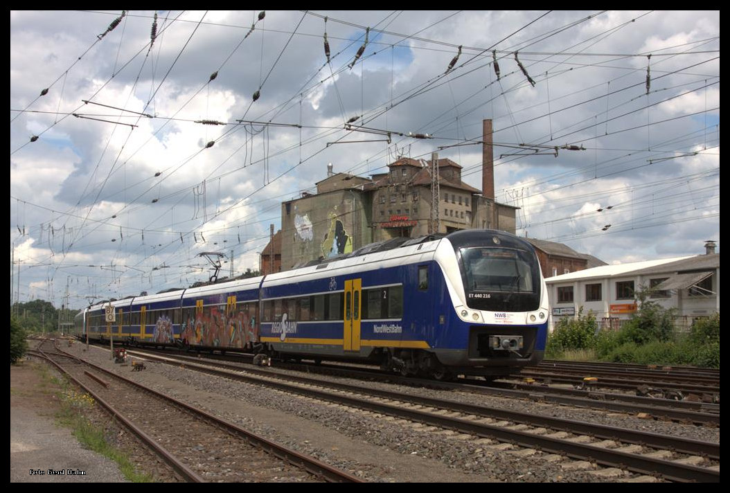ET 440216 der Nordwestbahn erreicht hier am 4.7.2016 um 13.24 Uhr den Endbahnhof Verden an der Aller.