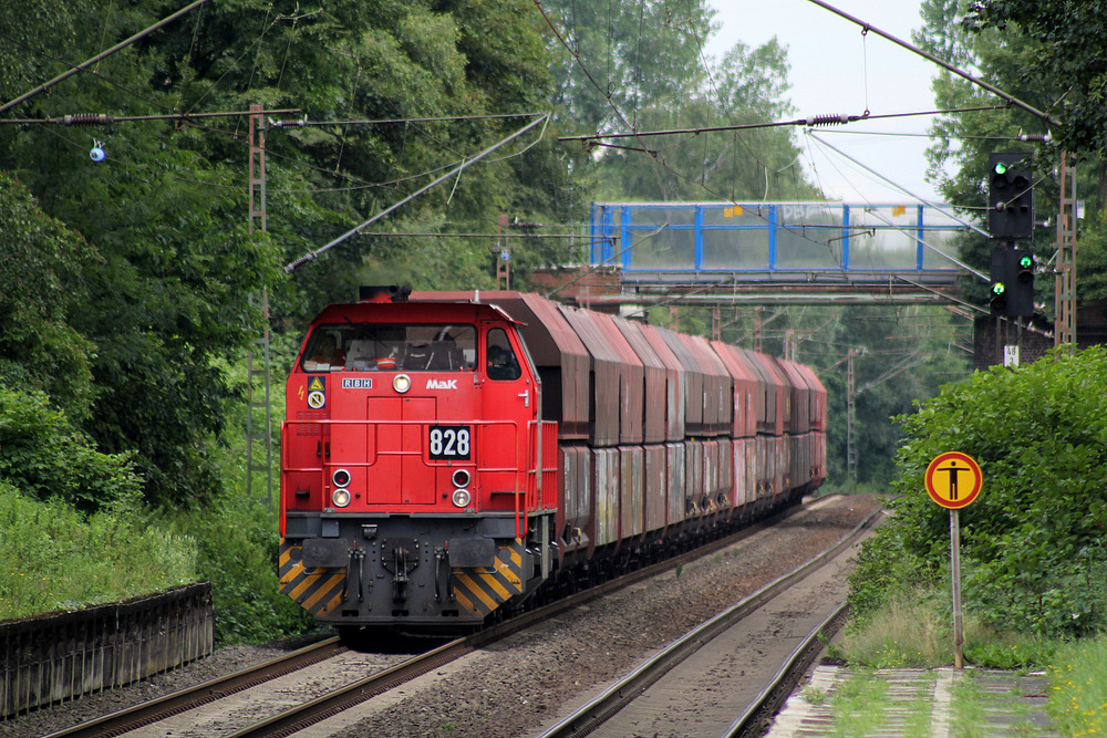 RBH 828 mit einem leeren Wagenpark, aufgenommen vom Bahnsteig des Haltepunkts Bottrop-Boy.