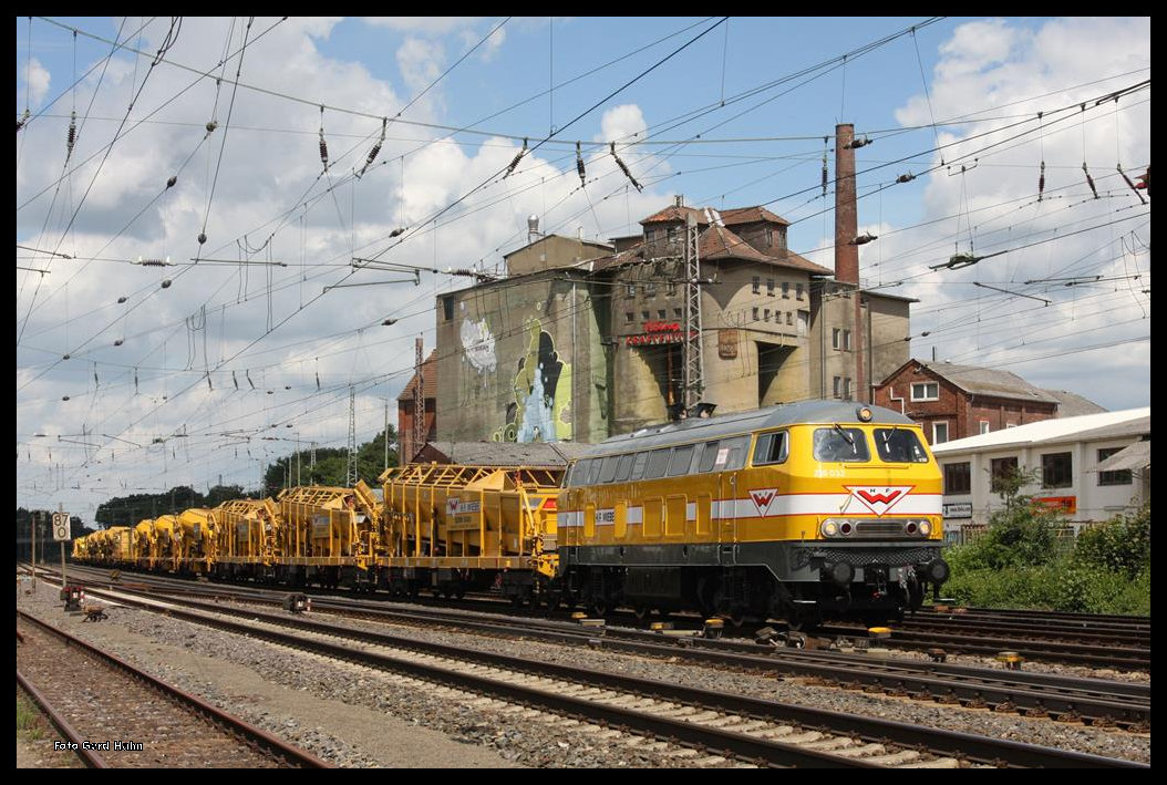 Wiebe 216032 kam am 4.7.2016 um 13.02 Uhr mit einem Gleisbett Reinigungszug aus Richtung Norden durch den Bahnhof Verden.