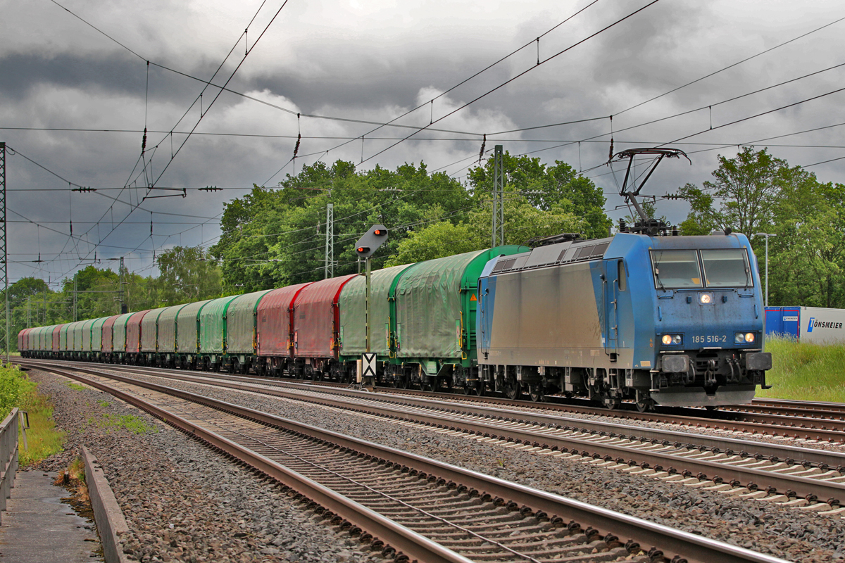 185 516-2 donnert in Gütersloh mit einem farbenfrohen Stahlzug Richtung Ruhrpott vorüber.Bild vom 23.5.2016