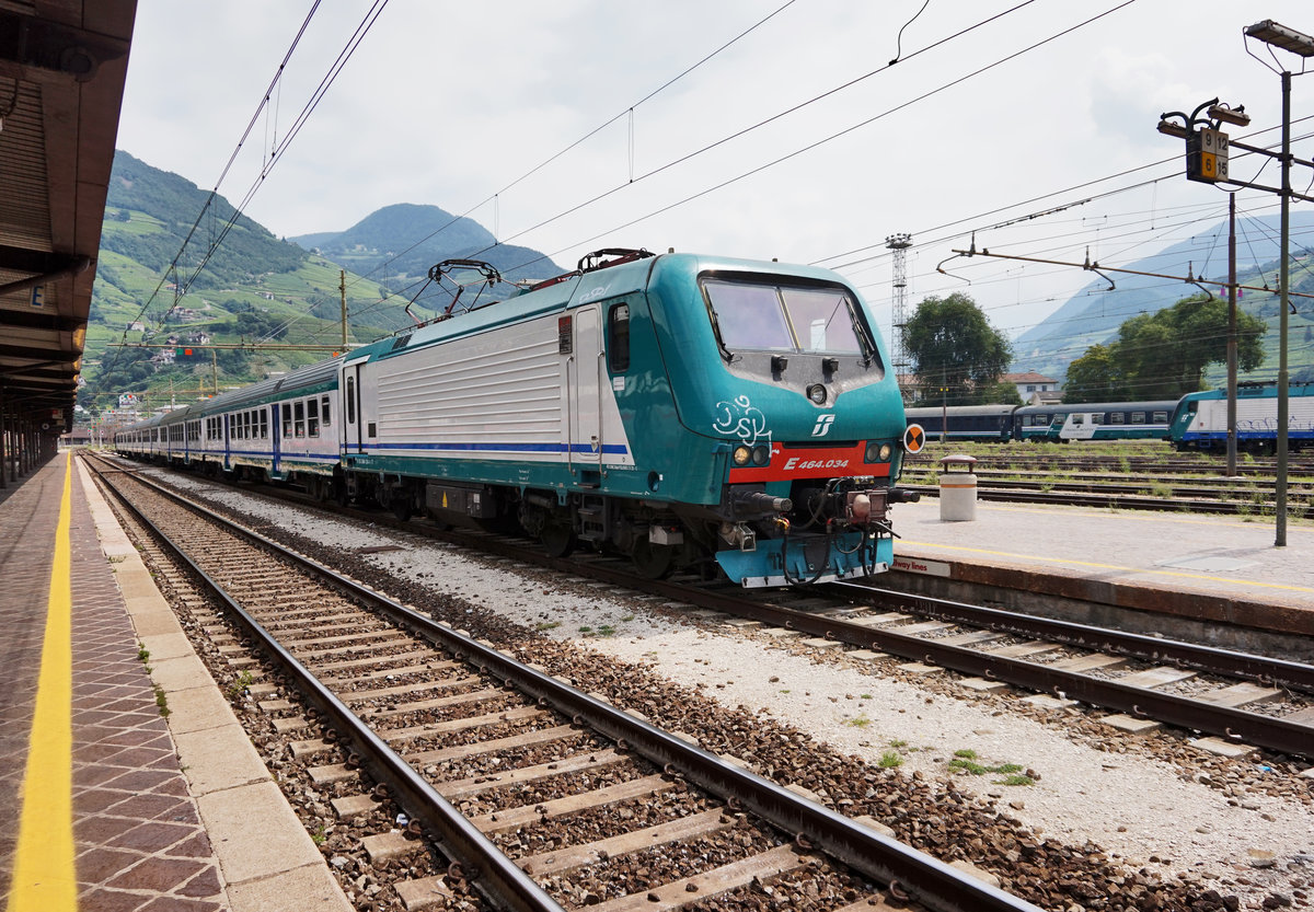 464 055-9 hält am 8.7.2016, mit R 20719 (Brennero/Brenner - Merano/Meran), im Bahnhof Bolzano/Bozen.
