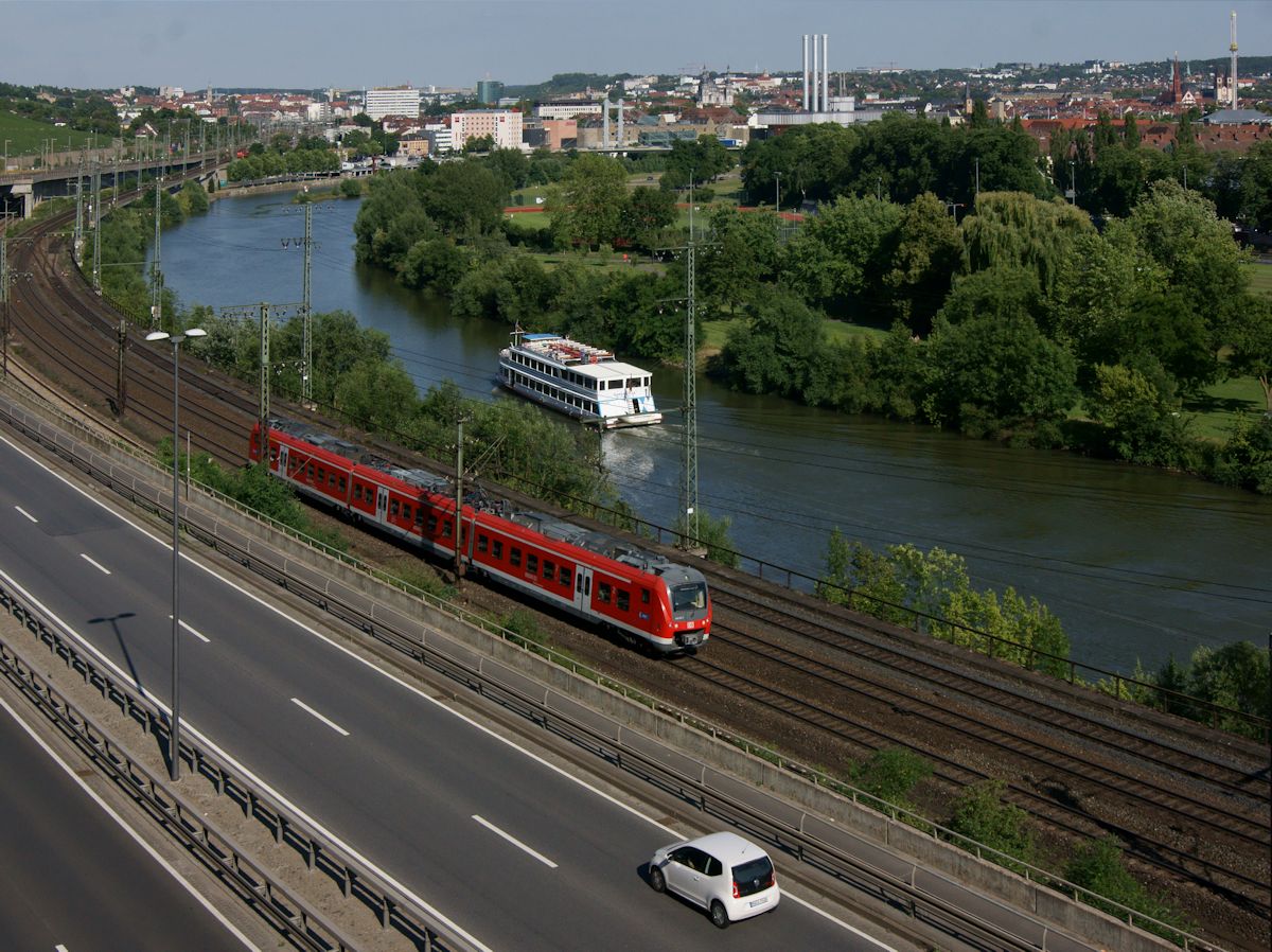 Am 07.07.2016 ist 440 307 als RB 58058 von Treuchtlingen nach Karlstadt (Main) unterwegs und begegnet unterhalb der Weinberge des Bürgerspitals in Würzburg dem Fahrgastschiff MS Barbarossa. Im Hintergrund sind neben der Würzburger Residenz auch der Dom und das Riesenrad auf dem Volksfest Kiliani zu sehen.