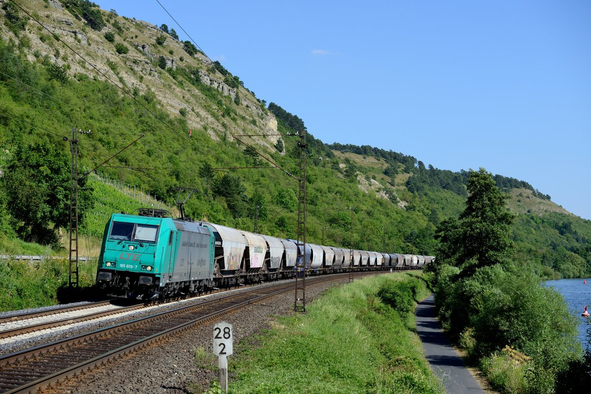 Am 20. Juli 2013 konnte auch ein Getreidezug in der Gegenrichtung aufgenommen werden, befördert von der LTE 185 608. Hier legt sich der Zug im Maintal zwischen Karlstadt und Gambach in die Kurve.