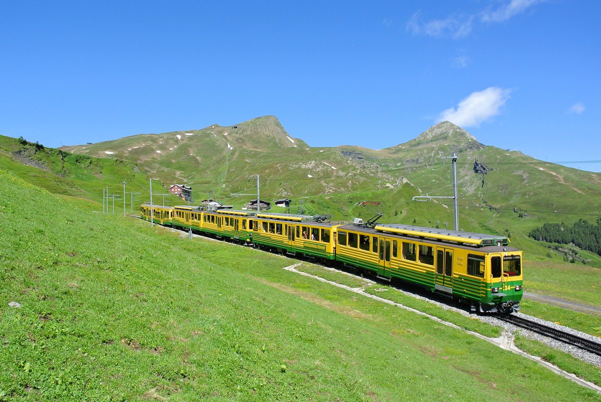 Auch auf der WAB verkehren noch alte BDeh Pendel. Auf der Lauterbrunner und auf der Grindelwaldner Seite verkehren sie auch heute noch täglich als Zusatzzüge. Im Sommer Seite Lauterbrunnen sogar mit zwei Steuerwagen: BDeh 4/4 Nr. 111 erreicht in Kürze von Grindelwald Grund her kommend seinen Zielbahnhof kleine Scheidegg, 04.07.2016.