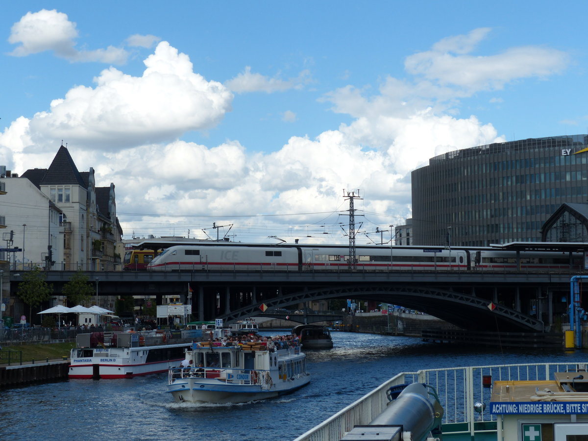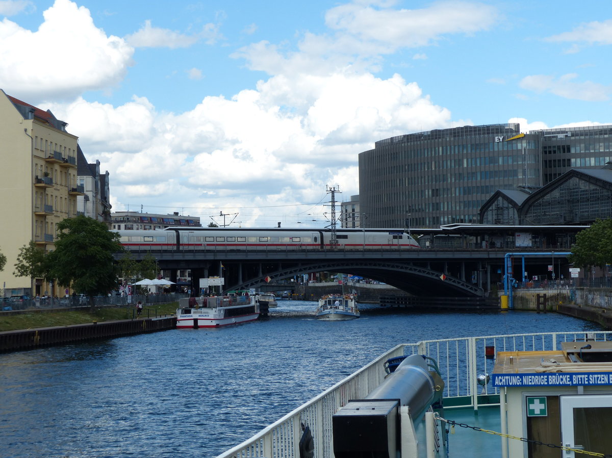 Eine Seefahrt, die ist lustig ... und in Berlin durchaus auch etwas für uns Bahnfans. Nun ist die Spree kein See, sondern ein Fluss, aber sie verläuft großenteils parallel zur Stadtbahn und kreuzt diese sowie die U-Bahnlinie 1 in Friedrichshain-Kreuzberg. Hier durchfährt gerade ein ICE den Bahnhof Friedrichstraße. Dieser Bahnhof ist jedoch schon sehr lange kein Fernbahnhof mehr, der ICE braust durch. 3.7.2016