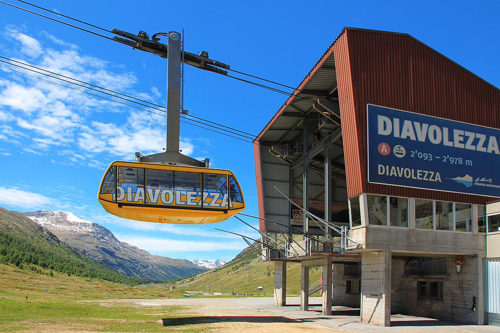 Die gelbe Gondel der Luftseilbahn Diavolezza verlässt gerade die Talstation, 28. Juni 2016