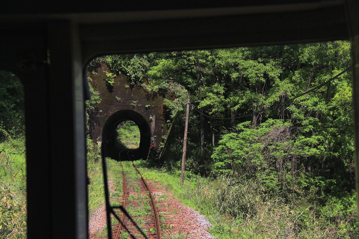 Die südliche der beiden Transversalen quer über die Insel Kyûshû (die Hôhi Hauptlinie), die jetzt grösstenteils durch Erdbeben zerstört ist, sieht nicht wie eine Hauptlinie aus und führt durch schwierigstes Gelände. Hier ein Blick aus dem Dieseltriebwagen zwischen Tamarai und dem kleinen Flecken Bungo Ogi, bis wohin jetzt kaum noch ein Zug vorstösst. 1.Mai 2016. HÔHI-HAUPTLINIE