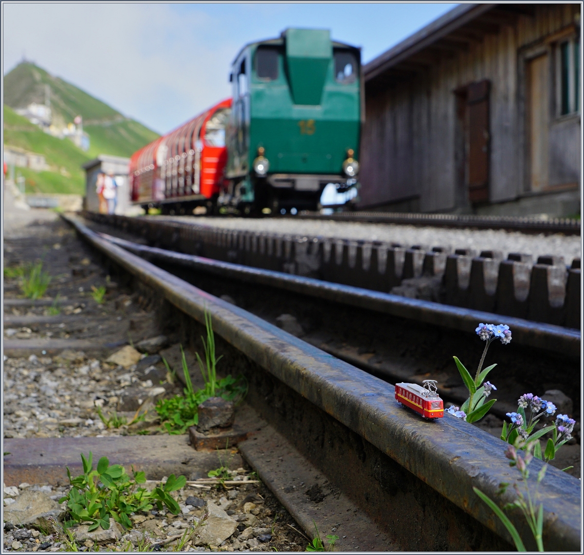 Materialzug mit Diesellok 10 und der erste Passagierzug des Tages mit Dampflok 12 in der Bergstation Rothorn Kulm. (20.06.2016)