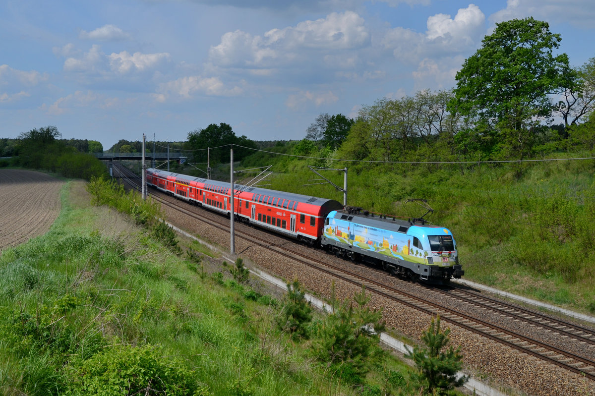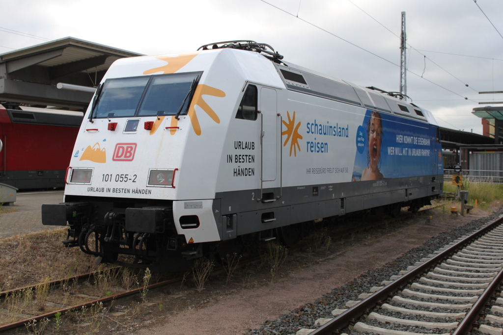 101 055-2 "Schauinsland Reisen" stand am Morgen des 10.06.2016 im Rostocker Hbf abgestellt.