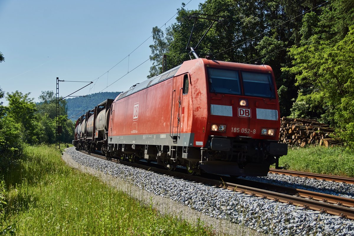 185 052-8 ist hier am 07.06.16 mit einen Containerzug in Richtung Norden bei Rieneck zu sehen.