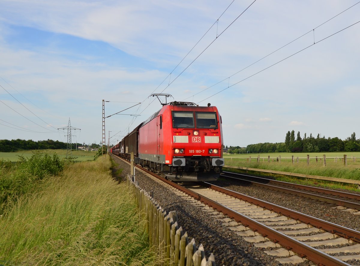 185 180-7 mit einem VW Autozug nach Aachen West bei Wickrathhahn. 8.6.2016